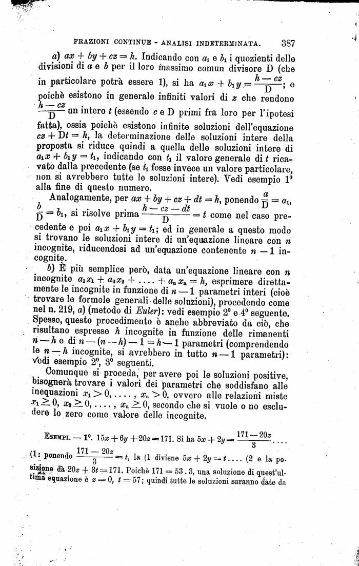 b) E più semplice però, data un'equazione lineare con n incognite a^Xi +. a2x3 +----+ aaxa h, esprimere direttamente le incognite in funzione di n 1 parametri interi (cioè trovare le formole generali delle soluzioni), procedendo come nel n. 219, a) (metodo di Euler): vedi esempio 2° e 4° seguente. Spesso, questo procedimento è anche abbreviato da ciò, che risultano espresse h incognite in funzione delle rimanenti n he di n (n h) 1 = 1 parametri (comprendendo le n h incognite, si avrebbero in tutto n 1 parametri): Vedi esempio 2°, 3° seguenti.