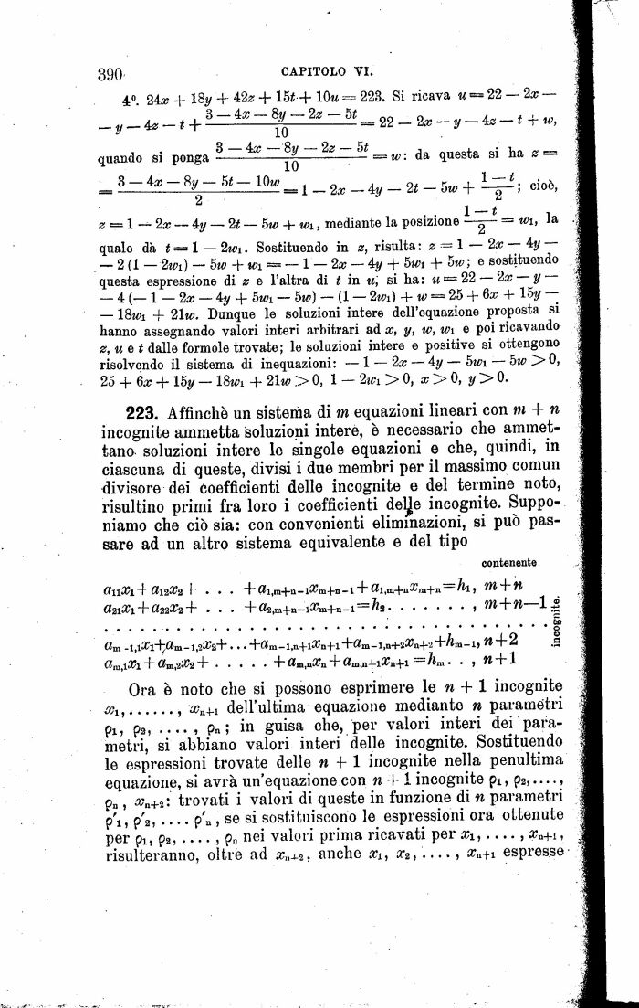 223. Affinchè un sistema di m equazioni lineari con m + n incognite ammetta soluzioni intere, è necessario che ammettano soluzioni intere le singole equazioni e che, quindi, in ciascuna di queste, divisi i due membri per il massimo comun divisore dei coefficienti delle incognite e del termine noto, risultino primi fra loro i coefficienti delje incognite. Supponiamo che ciò sia: con convenienti eliminazioni, si può passare ad un altro sistema equivalente e del tipo