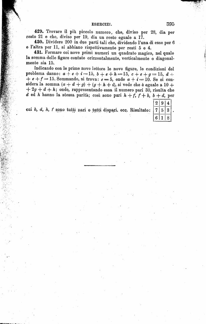 431. Formare coi nove primi numeri un quadrato magico, nel quale la somma delle figure contate orizzontalmente, verticalmente o diagonalmente sia 15.
