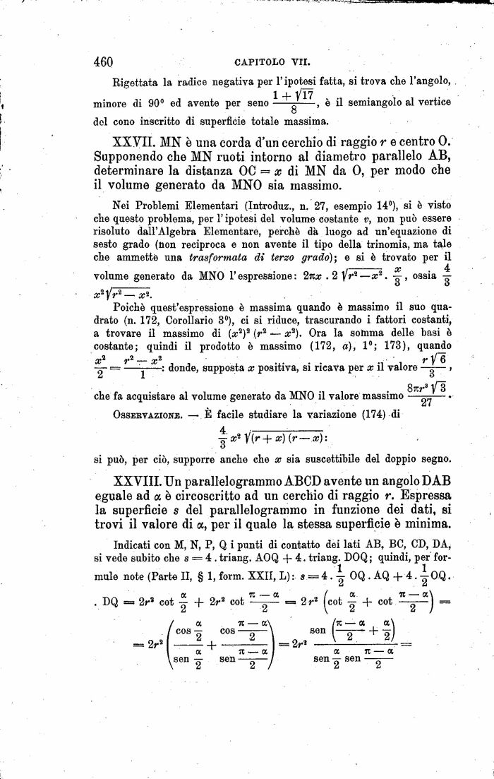 XXVII. MN è una corda d'un cerchio di raggio r e centro 0. Supponendo che MN ruoti intorno al diametro parallelo AB, determinare la distanza OC = x di MN da 0, per modo che il volume generato da MNO sia massimo.