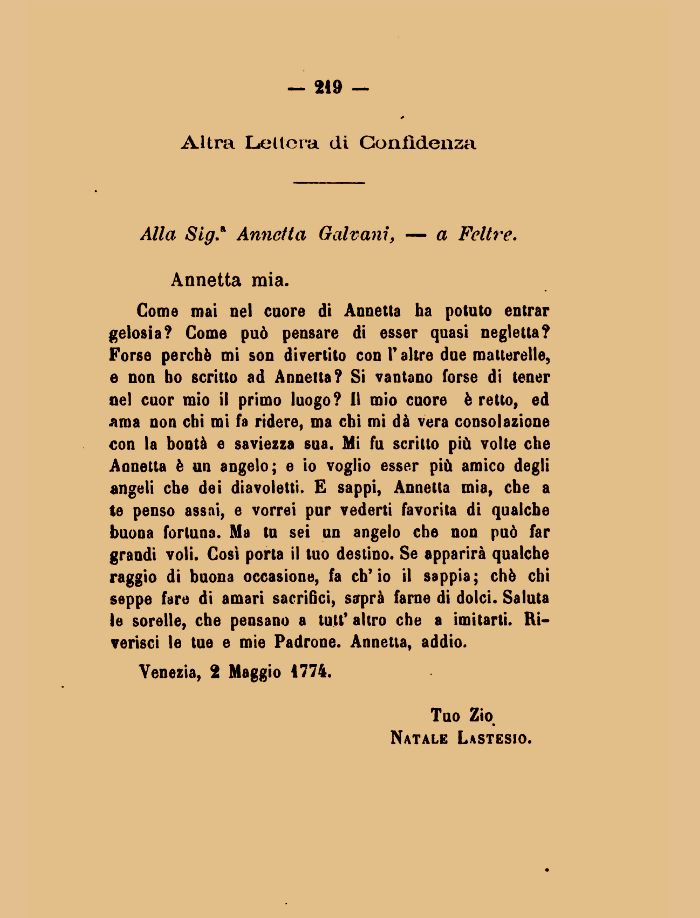 Come mai nel cuore di Annetta ha potuto entrar gelosia? Come può pensare di esser quasi negletta? Forse perchè mi son divertito con V altre due matterello, e non ho scritto ad Annetta? Si vantano forse di tener nel cuor mio il primo luogo? Il mio cuore è retto, ed .ama non chi mi fa ridere, ma chi mi dà vera consolazione con la bontà e saviezza sua. Mi fu scritto più volte che Annetta è un angelo; e io voglio esser più amico degli angeli che dei diavoletti. E sappi, Annetta mia, che a te penso assai, e vorrei pur vederti favorita di qualche buona fortuna. Ma tu sei un angelo che non può far grandi voli. Così porta il tuo destino. Se apparirà qualche raggio di buona occasione, fa ch'io il sappia; chè chi seppe fare di amari sacrifici, saprà farne di dolci. Saluta le sorelle, che pensano a tutt' altro che a imitarti. Riverisci le tue e mie Padrone. Annetta, addio.