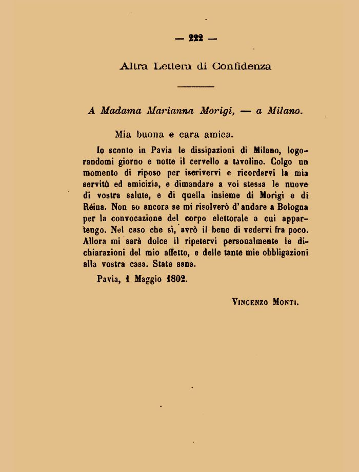 Io sconto in Pavia le dissipazioni di Milano, logorandomi giorno e notte il cervello a tavolino. Colgo nn momento di riposo per iscrivervi e ricordarvi la mia servitù ed amicizia, e dimandare a voi stessa le nuove di vostra salute, e di quella insieme di Morigi e di Réina. Non so ancora se mi risolverò d'andare a Bologna per la convocazione del corpo elettorale a cui appartengo. Net caso che sì, avrò il bene di vedervi fra poco. Allora mi sarà dolce il ripetervi personalmente le dichiarazioni del mio affetto, e delle tante mie obbligazioni alla vostra casa. State sana.