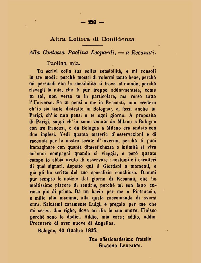 Tuo affezionatissimo fratello Giacomo Leopardi.