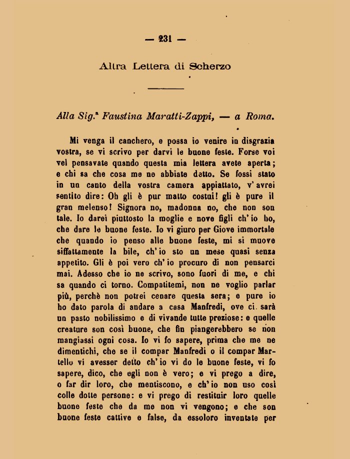 Mi venga il canchero, e possa io venire ìd disgrazia vostra, se vi scrivo per darvi le buone feste. Forse voi vel pensavate quando questa mia lettera avete aperta; e chi sa che cosa me no abbiate detto. Se fossi stato in uq canto della vostra camera appiattato, v' avrei sentito dire: Oh gli è pur matto costui! gli è pure il gran melenso! Signora no, madonna no, che non son tale. Io darei piuttosto la moglie e nove figli ch'io ho, che dare le buone feste. Io vi giuro per Giove immortale che quando io penso alle buone feste, mi si muove siffattamente la bile, eh' io sto un mese quasi senza appetito. Gli è poi vero eh1 io procuro di non pensarci mai. Adesso che io ne scrivo, sono fuori di me, e chi sa quando ci torno. Compatitemi, non ne voglio parlar più, perchè non potrei cenare questa sera; e pure io ho dato parola di andare a casa Manfredi, ove ci. sarà un pasto nobilissimo e di vivande tutte preziose: e quelle creature son così buone, che fin piangerebbero se non mangiassi ogni cosa. Io vi fo sapere, prima che me ne dimentichi, che se il compar Manfredi o il compar Martello vi avesser detto ch'io vi do le buone feste, vi fo sapere, dico, che egli non è vero; e vi prego a dire, o far dir loro, che mentiscono, e eh' io non uso così colle dotte persone: e vi prego di restituir loro quelle buone feste che da me non vi vengono; e che son buone feste cattive e false, da essoloro inventate per