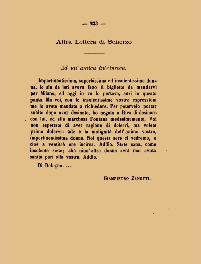 Impertinentissima, superbissima ed insolentissima donna. Io sin da ieri aveva fatto il biglietto da mandarvi per Milano, ed oggi io ve lo portava, anzi in questo punto. Ma voi, con le insolentissimo vostre espressioni me Io avete mandato a richiedere. Per potervelo portar subito dopo aver desinato, ho negato a Riva di desinare con lui, ed alla marchesa Fontana medesimamente. Voi non aspettate di aver ragione di dolervi, ma volete prima dolervi: tale è la malignità dell'animo vostro, impertinentissima donna. Noi questa sera ci vedremo, e cioè a ventitré ore incirca. Addio. State sana, come insolente siete; chè niun' altra donna avrà mai avuto sanità pari alla vostra. Addio.