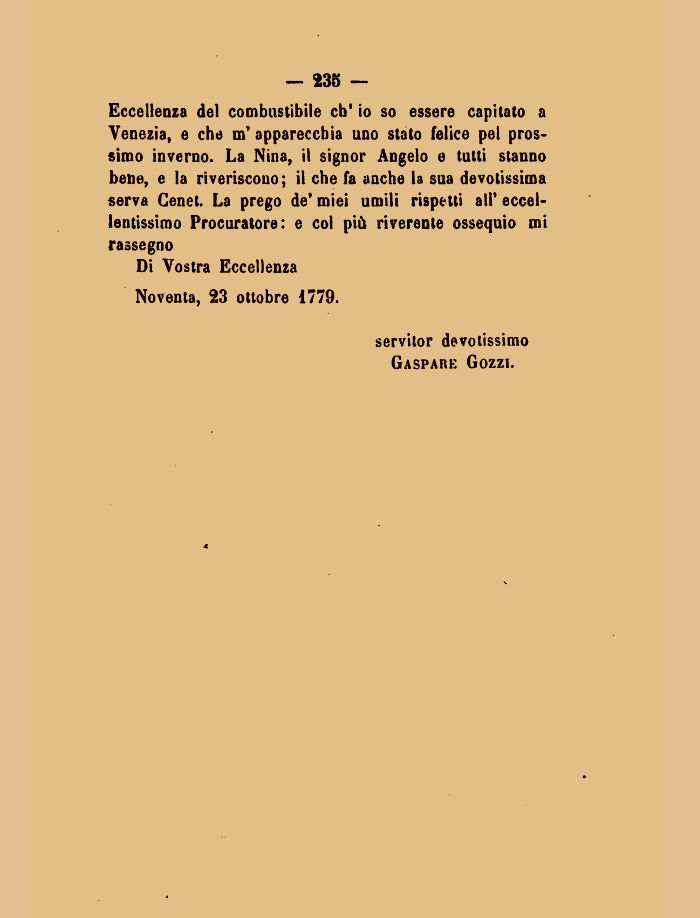 Eccellenza del combustibile eh* io so essere capitato a Venezia, e che m' apparecchia uno stato felice pel prossimo inverno. La Nina, il signor Angelo e tutti stanno bene, e la riveriscono; il che fa anche la sua devotissima serva Cenet. La prego de* miei umili rispetti all' eccellentissimo Procuratore: e col più riverente ossequio mi rassegno