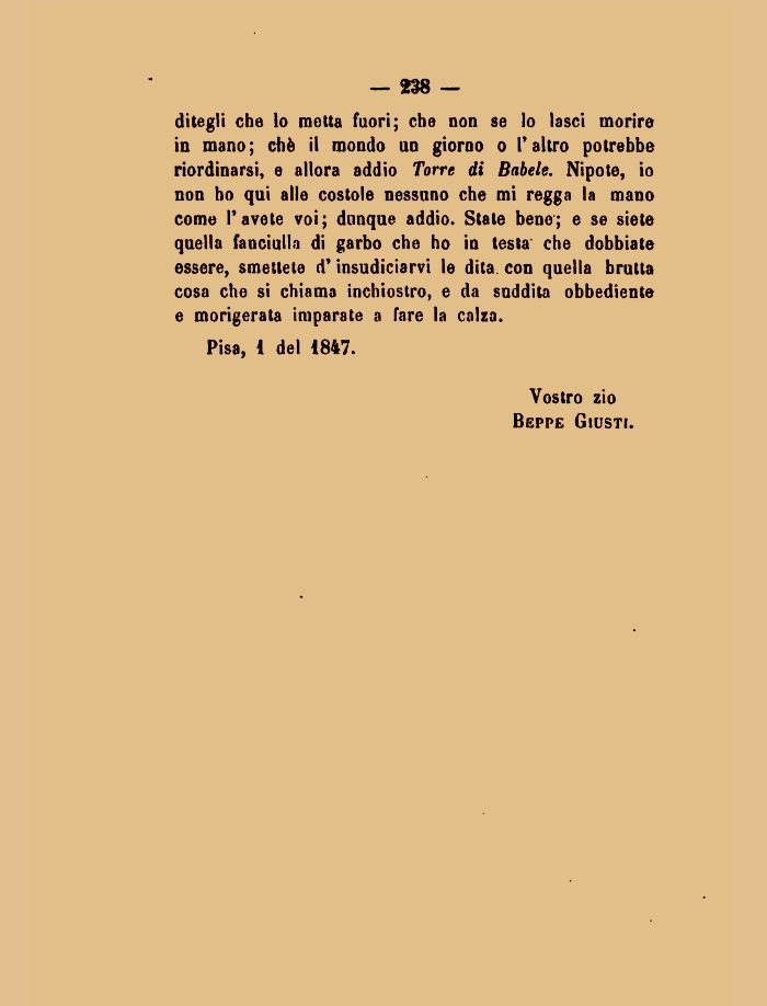 ditegli che lo metta fuori; che non se lo lasci morire in mano; chè il mondo un giorno o l'altro potrebbe riordinarsi, e allora addio Torre di Babele. Nipote, io non ho qui alle costole nessuno che mi regga la mano come Pavete voi; dunque addio. Stale bene; e se siete quella fanciulla di garbo che ho in testa che dobbiate essere, smettete d'insudiciarvi le dita, con quella brutta cosa che si chiama inchiostro, e da suddita obbediente e morigerata imparate a fare la calza.