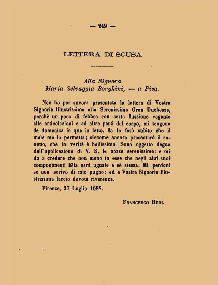 Non ho per ancora presentata la lettera di Vostra Signoria Illustrissima alla Serenissima Gran Duchessa, perchè un poco di febbre con certa flussione vagante alle articolazioni e ad altre parti del corpo, mi tengono da domenica in qua in letto, (o lo farò subito che il male me lo permetta; siccome ancora presenterò il sonetto, che in verità è bellissimo. Sono oggetto degno dell'applicazione di V. S. le nozze serenissime: e mi do a credere che non meno in esse che negli altri suoi componimenti Ella sarà uguale a sè stessa. Mi perdoni se non iscrivo di mio pugno: ed a Vostra Signoria Illustrissima faccio devota riverenza.