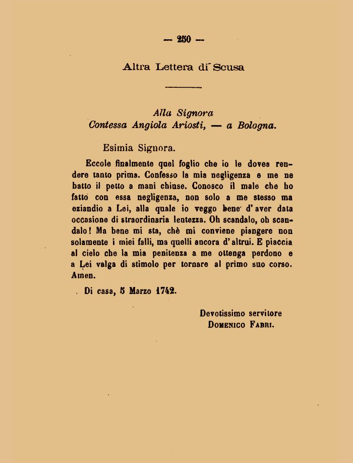 Eccole finalmente quel foglio che io le dovea rendere tanto prima. Confesso la mia negligenza e me ne batto il petto a mani chiuse. Conosco il male che ho fatto con essa negligenza, non solo a me stesso ma eziandio a Lei, alla quale io veggo bene' d'aver data occasione di straordinaria lentezza. Oh scandalo, oh scandalo! Ma bene mi sta, chè mi conviene piangere non solamente i miei falli, ma quelli ancora d'altrui. E piaccia al cielo che la mia penitenza a me ottenga perdono e a Lei valga di stimolo per tornare al primo suo corso. Amen.