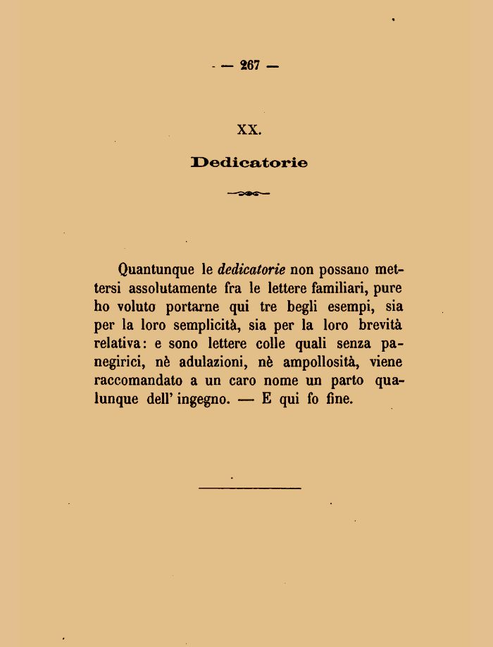 Quantunque le dedicatorie non possano mettersi assolutamente fra le lettere familiari, pure ho voluto portarne qui tre begli esempi, sia per la loro semplicitā, sia per la loro brevitā relativa: e sono lettere colle quali senza panegirici, nč adulazioni, nč ampollositā, viene raccomandato a un caro nome un parto qualunque dell' ingegno. E qui fo fine.