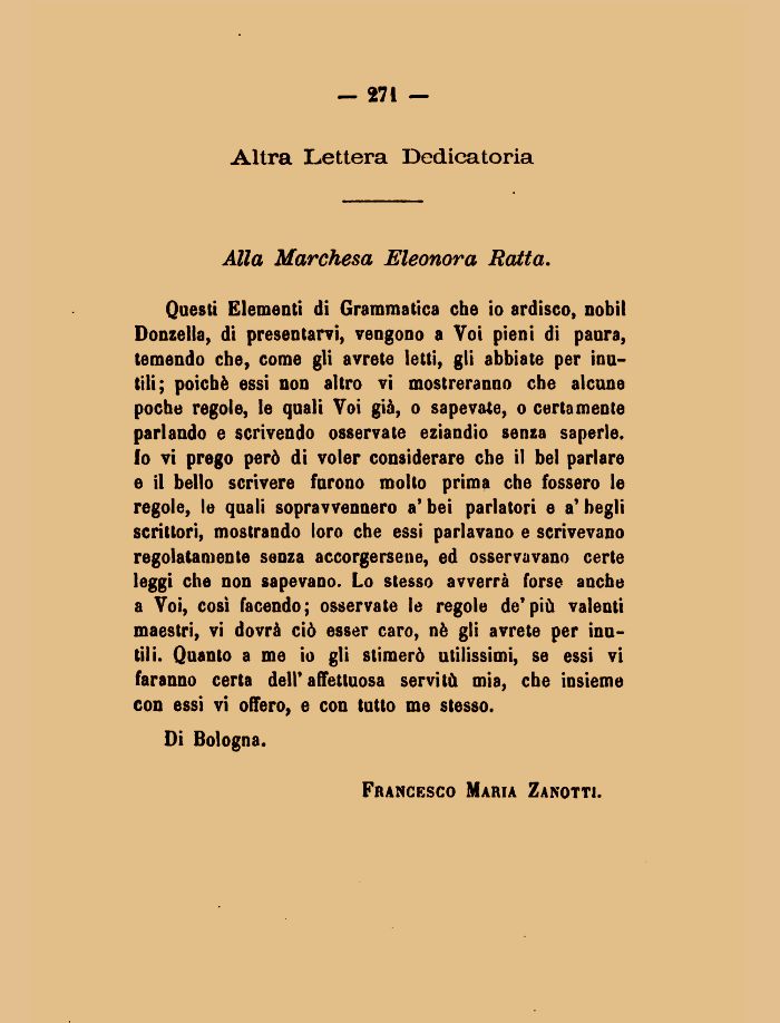 Questi Elementi di Grammatica che io ardisco, nobil Donzella, di presentarvi, vengono a Voi pieni di paura, temendo che, come gli avrete Ietti, gli abbiate per inutili; poiché essi non altro vi mostreranno che alcune poche regole, le quali Voi già, o sapevate, o certamente parlando e scrivendo osservate eziandio senza saperle, lo vi prego però di voler considerare che il bel parlare e il bello scrivere furono molto prima che fossero le regole, le quali sopravvennero a' bei parlatori e a' begli scrittori, mostrando loro che essi parlavano e scrivevano regolatamente senza accorgersene, ed osservavano certe leggi che non sapevano. Lo stesso avverrà forse anche a Voi, così facendo; osservate le regole de'più valenti maestri, vi dovrà ciò esser caro, nè gli avrete per inutili. Quanto a me io gli stimerò utilissimi, se essi vi faranno certa dell'affettuosa servitù mia, che insieme con essi vi offero, e con tutto me stesso.