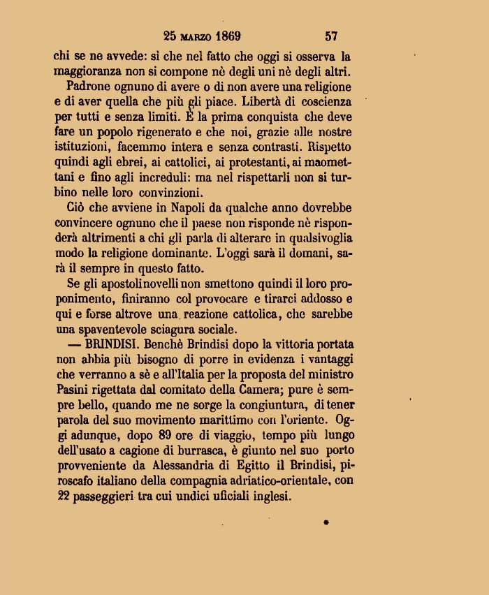 — BRINDISI. Benché Brindisi dopo la vittoria portata non abbia più bisogno di porre in evidenza i vantaggi che verranno a sè e all'Italia per la proposta del ministro Pasini rigettata dal comitato della Camera; pure è sempre bello, quando me ne sorge la congiuntura, di tener parola del suo movimento maritlimo con l'oriente. Oggi adunque, dopo 89 ore di viaggio, tempo più lungo dell'usato a cagione di burrasca, è giunto nel suo porto provvedente da Alessandria di Egitto il Brindisi, piroscafo italiano della compagnia adriatico-or ieri tale, con 22 passeggieri tra cui undici uficiali inglesi.