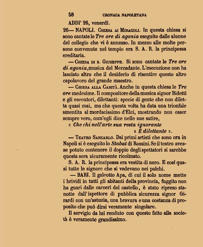— Teatro Sancarlo. Dai primi artisti che sono ora in Napoli si è eseguitolo Stabat di Rossini.Se il teatro avesse potuto contenere il doppio degli spettatori si sarebbe questa sera sicuramente ricolmato.