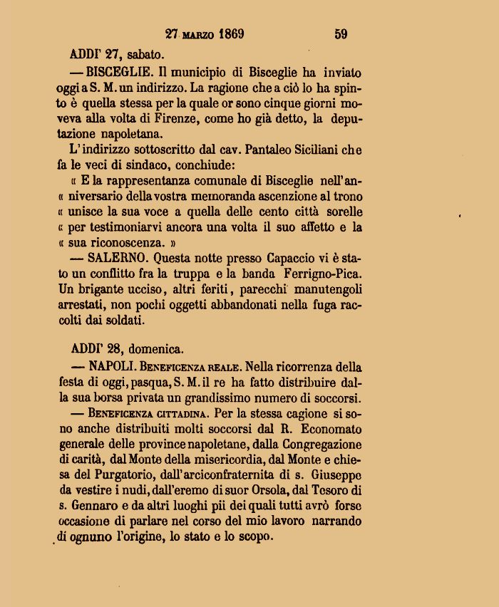 — Beneficenza cittadina. Per la stessa cagione si sono anche distribuiti molti soccorsi dal R. Economato generale delle province napoletane, dalla Congregazione di carità, dal Monte della misericordia, dal Monte e chiesa del Purgatorio, dall'arciconfraternita di s. Giuseppe da vestire i nudi, dall'eremo di suor Orsola, dal Tesoro di s. Gennaro e da altri luoghi pii dei quali tutti avrò forse occasione di parlare nel corso del mio lavoro narrando di ognuno l'origine, lo stato e lo scopo.