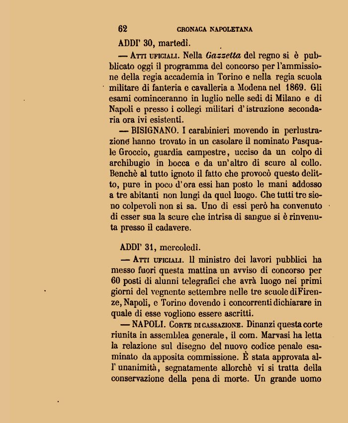 — NAPOLI. Corte di cassazione. Dinanzi questa corte riunita in assemblea generale, il com. Marvasi ha letta la relazione sul disegno del nuovo codice penale esaminato da apposita commissione. E stata approvata all' unanimità, segnatamente allorché vi si tratta della conservazione della pena di morte. Un grande uomo