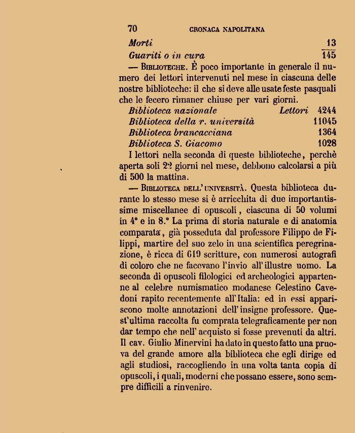 — Biblioteca dell' università. Questa biblioteca durante lo stesso mese si è arricchita di due importantissime miscellanee di opuscoli, ciascuna di 50 volumi in 4° e in 8.° La prima di storia naturale e di anatomia comparata', già posseduta dal professore Filippo de Filippi, martire del suo zelo in una scientifica peregrinazione, è ricca di G19 scritture, con numerosi autografi di coloro che ne facevano l'invio all'illustre uomo. La seconda di opuscoli filologici ed archeologici appartenne al celebre numismatico modanesc Celestino Cave-doni rapito recentemente air Italia: ed in essi appariscono molte annotazioni dell' insigne professore. Quest'ultima raccolta fu comprata telegraficamente per non dar tempo che nell' acquisto si fosse prevenuti da altri. Il cav. Giulio Minervini ha dato in questo fatto una pruo-va del grande amore alla biblioteca che egli dirige ed agli studiosi, raccogliendo in una volta tanta copia di opuscoli, i quali, moderni che possano essere, sono sempre difficili a rinvenire.