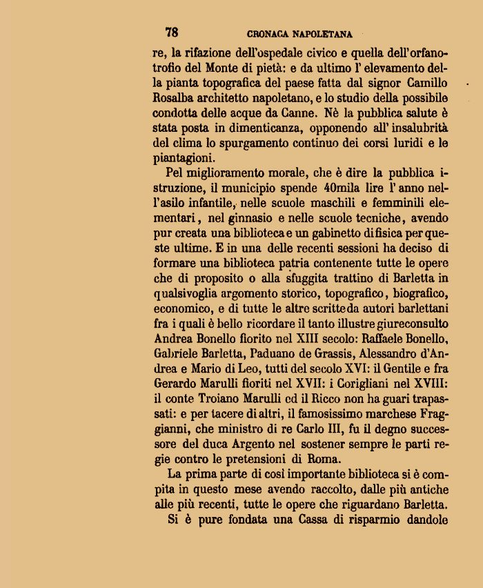 re, la rifazione dell'ospedale civico e quella dell'orfanotrofio del Monte di pietā: e da ultimo l'elevamento della pianta topografica del paese fatta dal signor Camillo Rosalba architetto napoletano, e lo studio della possibile condotta delle acque da Canne. Nč la pubblica salute č stata posta in dimenticanza, opponendo all' insalubritā del clima lo spurgamento continuo dei corsi luridi e le piantagioni.
