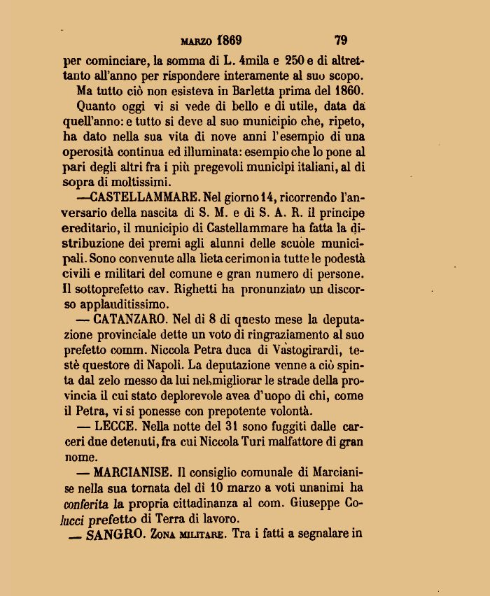 — CATANZARO. Nel di 8 di questo mese la deputazione provinciale dette un voto di ringraziamento al suo prefetto comm. Niccola Petra duca di Vastogirardi, testé questore di Napoli. La deputazione venne a ciò spinta dal zelo messo da lui nekmigliorar le strade della provincia il cui stato deplorevole avea d'uopo di chi, come il Petra, vi si ponesse con prepotente volontà.