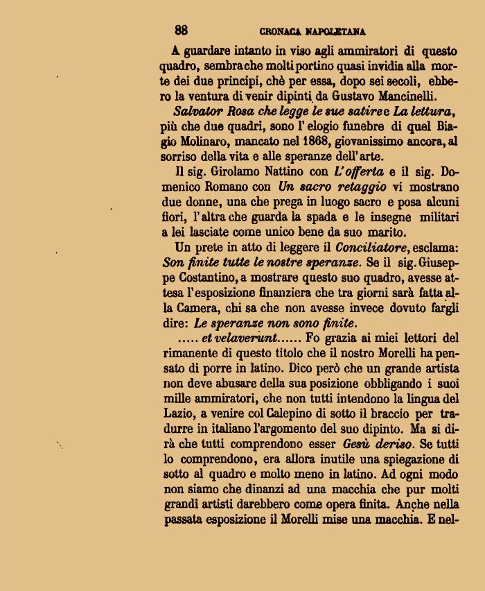 rimanente di questo titolo che il nostro Morelli ha pensato di porre in latino. Dico però che un grande artista non deve abusare della sua posizione obbligando i suoi mille ammiratori, che non tutti intendono la lingua del Lazio, a venire col Calepino di sotto il braccio per tradurre in italiano l'argomento del suo dipinto. Ma si dirà che tutti comprendono esser Gesù deriso. Se tutti lo comprendono, era allora inutile una spiegazione di sotto al quadro e molto meno in latino. Ad ogni modo non siamo che dinanzi ad una macchia che pur molti grandi artisti darebbero come opera finita. Anche nella passata esposizione il Morelli mise una macchia. E nel-