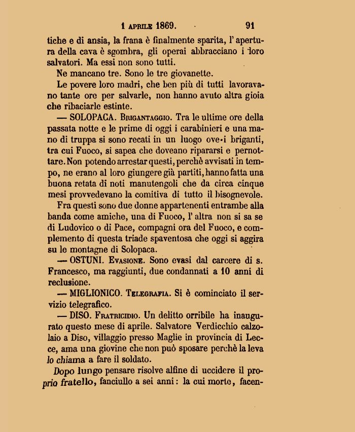 — DISO. Fratricidio. Un delitto orribile ha inaugurato questo mese di aprile. Salvatore Verdicchio calzolaio a Diso, villaggio presso Maglie in provincia di Lecce, ama una giovine che non può sposare perchè la leva io chiama a fare il soldato.