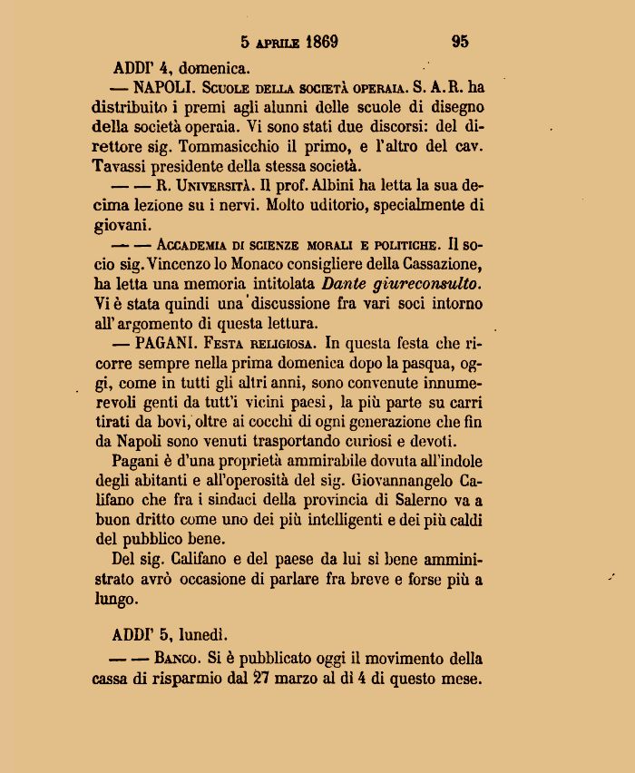 —--Accademia di scienze morali e politiche. Il socio sig. Vincenzo lo Monaco consigliere della Cassazione, ha letta una memoria intitolata Dante giureconsulto. Vi è stata quindi una ' discussione fra vari soci intorno all' argomento di questa lettura.