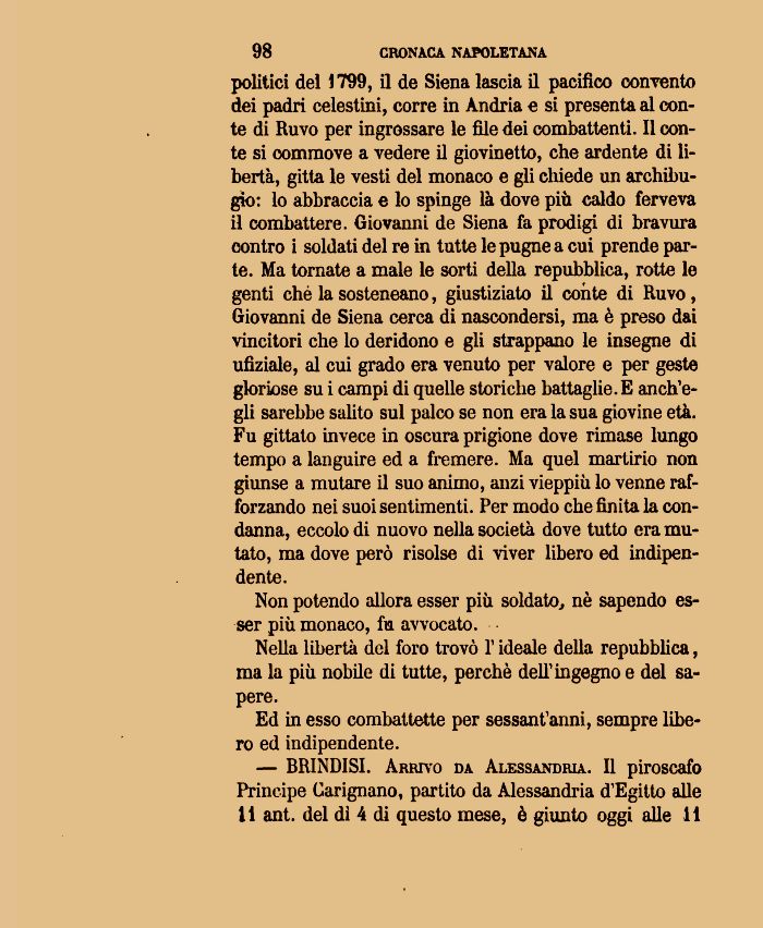 politici del 1799, il de Siena lascia il pacifico convento dei padri celestini, corre in Andria e si presenta al conte di Ruvo per ingrossare le file dei combattenti. Il conte si commove a vedere il giovinetto, che ardente di libertà, gitta le vesti del monaco e gli chiede un archibugio: lo abbraccia e lo spinge là dove più caldo ferveva il combattere. Giovanni de Siena fa prodigi di bravura contro i soldati del re in tutte le pugne a cui prende parte. Ma tornate a male le sorti della repubblica, rotte le genti ché la sosteneano, giustiziato il conte di Ruvo , Giovanni de Siena cerca di nascondersi, ma è preso dai vincitori che lo deridono e gli strappano le insegne di ufiziale, al cui grado era venuto per valore e per geste gloriose su ì campi di quelle storiche battaglie. E anch'egli sarebbe salito sul palco se non era la sua giovine età. Fu gittato invece in oscura prigione dove rimase lungo tempo a languire ed a fremere. Ma quel martirio non giunse a mutare il suo animo, anzi vieppiù lo venne rafforzando nei suoi sentimenti . Per modo che finita la condanna, eccolo di nuovo nella società dove tutto era mutato, ma dove però risolse di viver lìbero ed indipendente.