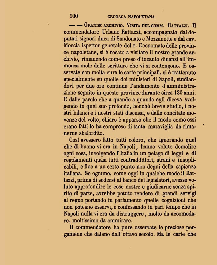 commendatore Urbano Rattazzi, accompagnato dai deputati signori duca di Sandonato e Mezzanotte e dal cav. Moccia ispettor generale del r. Economato delle province napoletane, si è recato a visitare il nostro grande archivio, rimanendo come preso d1 incanto dinanzi all' immensa mole delle scritture che vi si contengono. E osservate con molta cura le carte principali, si è trattenuto specialmente su quelle dei ministeri di Napoli, studiandovi per due ore continue l'andamento d'amministrazione seguito in queste province durante circa 130 anni. E dalle parole che a quando a quando egli diceva svolgendo in quel suo profondo, benché breve studio, i nostri bilanci e i nostri stati discussi, e dalle concitate movenze del volto, chiaro è apparso che il modo come essi erano fatti lo ha compreso di tanta maraviglia da rimanerne sbalordito.