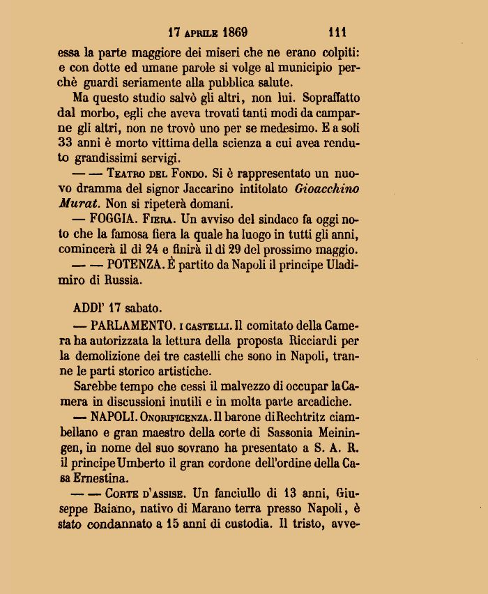 --- Teatro del Fondo. Si è rappresentato un nuovo dramma del signor Jaccarino intitolato Gioacchino Marat. Non si ripeterà domani.