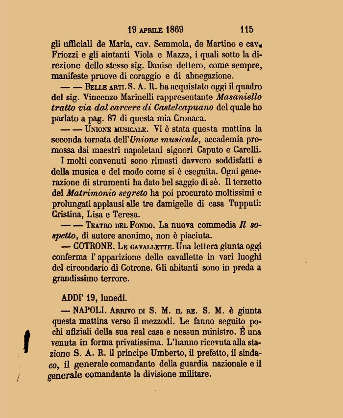 — NAPOLI. Arrivo di S. M. il re. S. M. è giunta questa mattina verso il mezzodì. Le fanno seguito pochi ufiziali della sua real casa e nessun ministro. È una venuta in forma privatissima. L'hanno ricevuta alla stazione S. A. R. il principe Umberto, il prefetto, il sindaco, il generale comandante della guardia nazionale e il generale comandante la divisione militare.