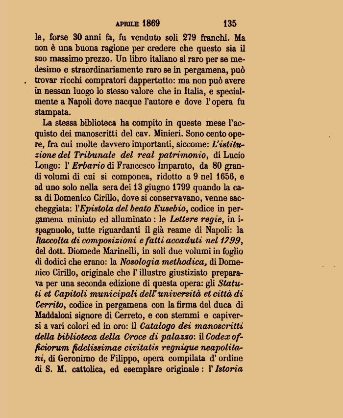 La stessa biblioteca ha compito in queste mese l'acquisto dei manoscritti del cav. Minieri. Sono cento opere, fra cui molte davvero importanti, siccome: V istituzione del Tribunale del real patrimonio, di Lucio Longo: 1' Erbario di Francesco Imparato, da 80 grandi volumi di cui si componea, ridotto a 9 nel 1656, e ad uno solo nella sera dei 13 giugno 1799 quando la casa di Domenico Cirillo, dove si conservavano, venne saccheggiata: XEpistola del beato Eusebio, codice in pergamena miniato ed alluminato : le Lettere regie, in i-spagnuolo, tutte riguardanti il già reame di Napoli: la Raccolta di composizioni e fatti accaduti nel 1799ì del dott. Diomede Marinelli, in soli due volumi in foglio di dodici che erano: la Nosologia methodica, di Domenico Cirillo, originale che l'illustre giustiziato preparava per una seconda edizione di questa opera: gli Statuti et Capitoli municipali dell'università et città di Cerrito, codice in pergamena con la firma del duca di Maddaloni signore di Cerreto, e con stemmi e capoversi a vari colori ed in oro: il Catalogo dei manoscritti della biblioteca della Croce di palazzo', il Codex of-ficiorum fìdelissimae civitatis regnique neapolita-ni, di Geronimo de Filippo, opera compilata d' ordine di S. M. cattolica, ed esemplare originale : l'Istoria