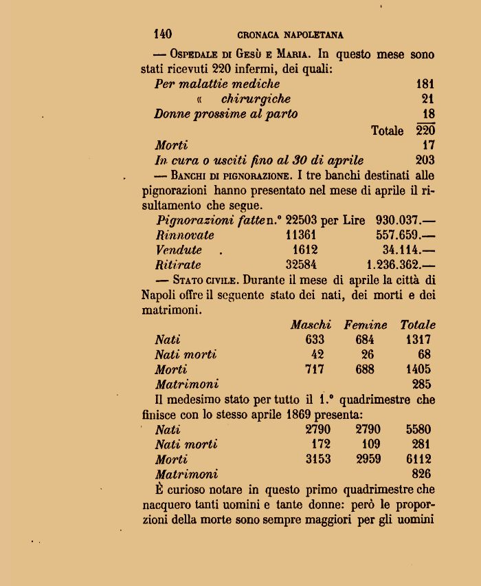 — Stato civile. Durante il mese di aprile la città di Napoli offre il seguente stato dei nati, dei morti e dei matrimoni.