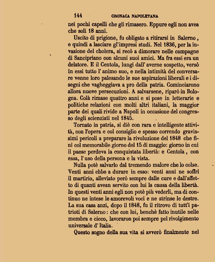 Uscito di prigione, fu obligato a ritirarsi in Salerno, e quindi a lasciare gì'impresi studi. Nel 1836, per la invasione del cholera, si recò a dimorare nelle campagne di Sancipriano con alcuni suoi amici. Ma fra essi era un delatore. E il Centola, lungi dall' averne sospetto, versò in essi tutto 1* animo suo, e nella intimità del conversare venne loro palesando le sue aspirazioni liberali e i disegni che vagheggiava a prò della patria. Cominciarono allora nuove persecuzioni. A salvarsene, riparò in Bologna. Colà rimase quattro anni e si pose in letterarie e politiche relazioni con molti altri italiani, la maggior parte dei quali rivide a Napoli in occasione del congresso degli scienziati nel 1845.