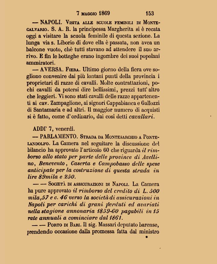 — AVERSA. Fiera, Ultimo giorno della fiera ove sogliono convenire dai più lontani punti della provincia i proprietari di razze di cavalli. Molte contrattazioni, pochi cavalli da potersi dire bellissimi, prezzi tutt1 altro che leggieri. Vi sono stati cavalli delle razze appartenenti ai cav. Zampaglione, ai signori Cappabianca e Gallozzi di Santamaria e ad altri. Il maggior numero di acquisti si è fatto, come d1 ordinario, dai cosi detti cavallari,