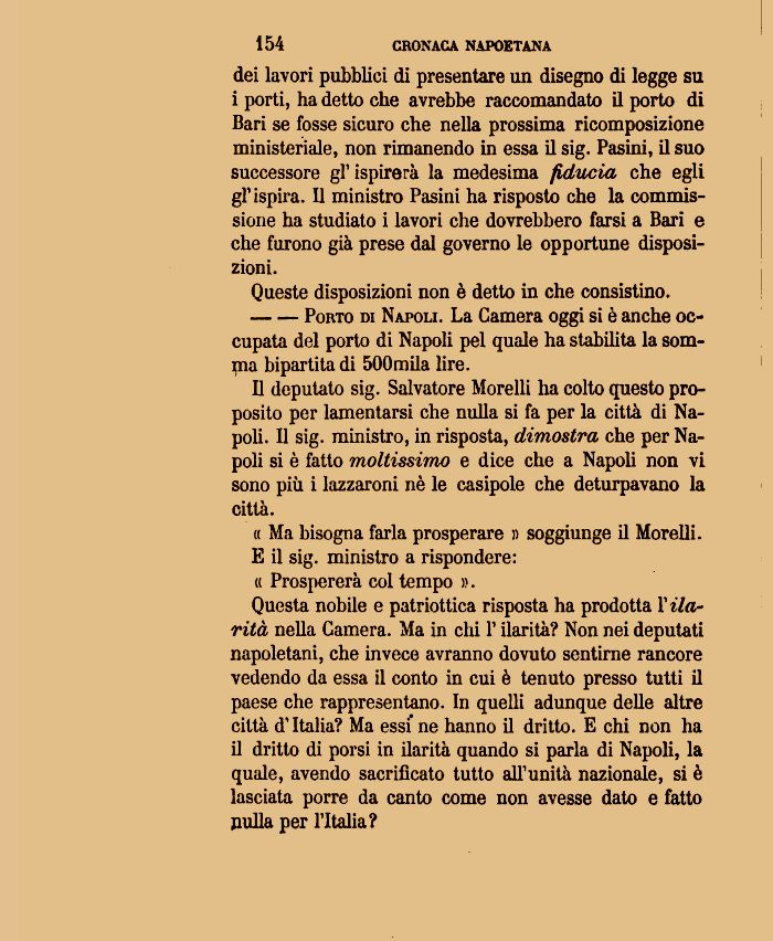 Il deputato sig. Salvatore Morelli ha colto questo proposito per lamentarsi che nulla sì fa per la città di Napoli. Il sig. ministro, in risposta, dimostra che per Napoli si è fatto moltissimo e dice che a Napoli non vi sono più i lazzaroni nè le casipole che deturpavano la città.