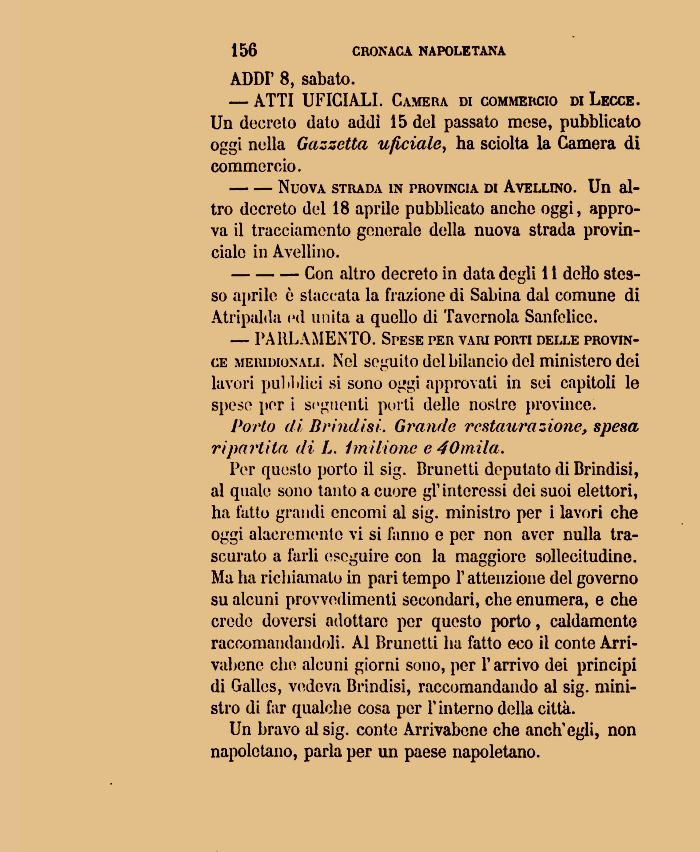 Per questo porto il sig. Brunetti deputato di Brindisi, al quale sono tanto a cuore gì1 interessi dei suoi elettori, ha fatto grandi encomi al sig. ministro per i lavori che oggi alacremente vi si fanno e per non aver nulla trascurato a farli eseguire con la maggiore sollecitudine. Ma ha richiamato in pari tempo 1' attenzione del governo su alcuni provvedimenti secondari, che enumera, e che credo doversi adottare per questo porto, caldamente raccomandandoli. Al Brunetti ha fatto eco il conte Arrivai ione che alcuni giorni sono, per l'arrivo dei principi di Galles, vedeva Brindisi, raccomandando al sig. ministro di far qualche cosa per 1' interno della città.