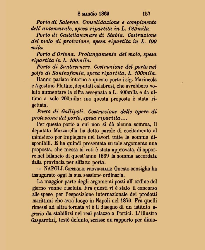Hanno parlato intorno a questo porto i sig. Marincola e Agostino Fiutino, deputati calabresi, che avrebbero voluto aumentare la cifra assegnata a L. 400mila e da ultimo a sole 200mila: ma questa proposta è stata rigettata.