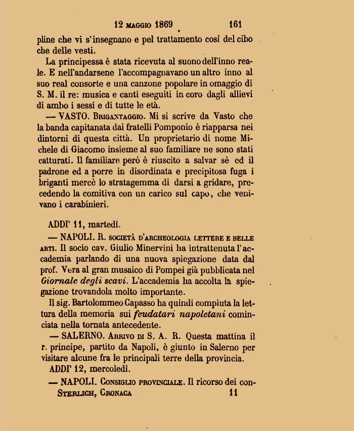 — VASTO. Brigantaggio. Mi si scrive da Vasto che la banda capitanata dai fratelli Pomponio è riapparsa nei dintorni dì questa città. Un proprietario di nome Michele di Giacomo insieme al suo familiare ne sono stati catturati. Il familiare però è riuscito a salvar sè ed il padrone ed a porre in disordinata e precipitosa fuga i briganti mercè lo stratagemma di darsi a gridare, precedendo la comitiva con un carico sul capo, che venivano ì carabinieri.