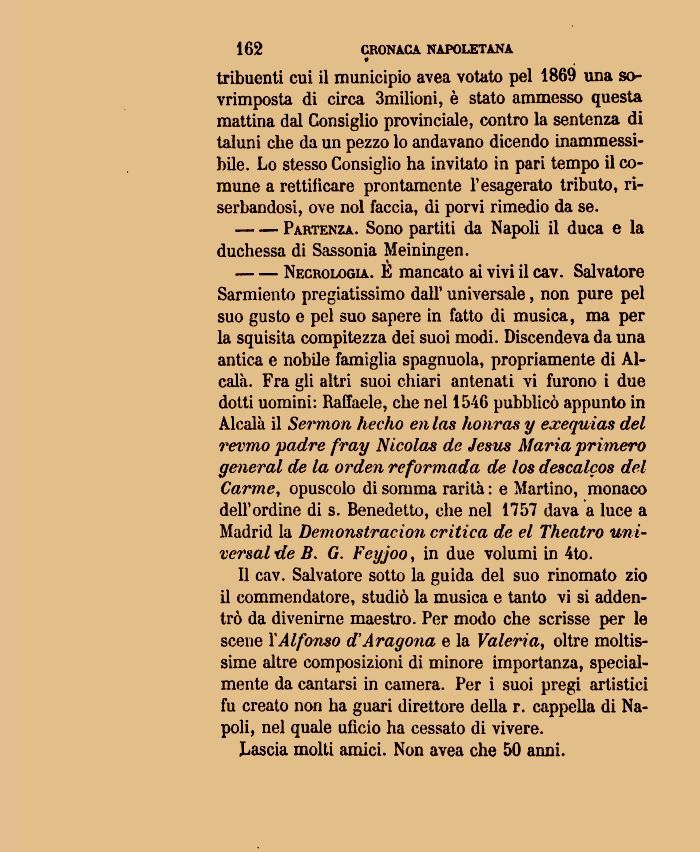 Sarmiento pregiatissimo dall' uni versale, non pure pel suo gusto e pel suo sapere in fatto di musica, ma per la squisita compitezza dei suoi modi. Discendeva da una antica e nobile famìglia spagnuola, propriamente di Ai-cala. Fra gli altri suoi chiari antenati vi furono i due dotti uomini: Raffaele, che nel 1546 pubblicò appunto in Alcalà il Sermon hecho en las kouros y exequias del revmo padre fray Nicolas de Jesus Maria primero general de la orden reformada de los descalcos del Carme, opuscolo di somma rarità : e Martino, monaco dell'ordine di s. Benedetto, che nel 1757 dava a luce a Madrid la Demonstracion critica de el Theatro uni-versalde B. G. Feyjoo, in due volumi in 4to.