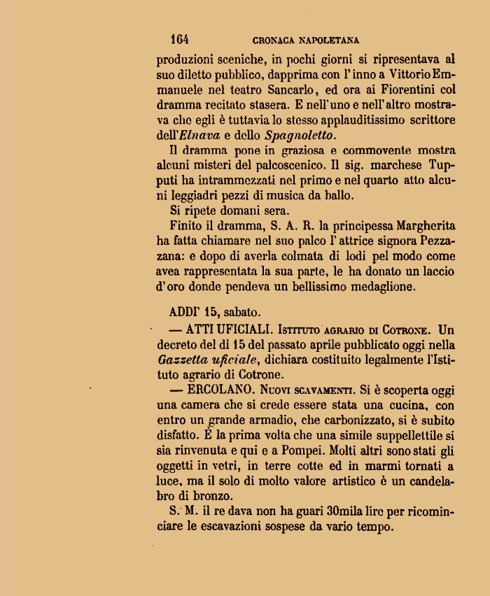 — ERCOLAISO. Nuovi scavamenti. Si è scoperta oggi una camera che si crede essere stata una cucina, con entro un grande armadio, che carbonizzato, si è subito disfatto. E la prima volta che una simile suppellettile si sia rinvenuta e qui e a Pompei. Molti altri sono stati gli oggetti in vetri, in terre cotte ed in marmi tornati a luce, ma il solo di molto valore artistico è un candelabro di bronzo.