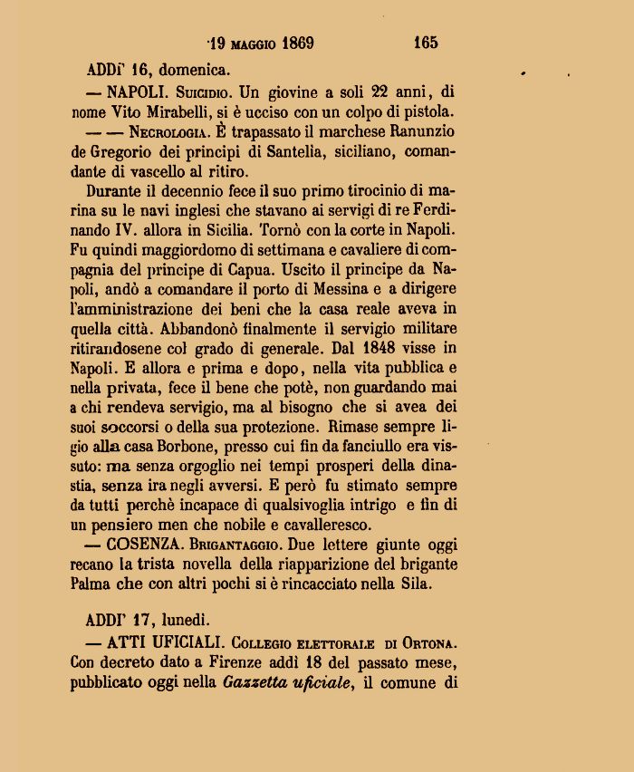 — COSENZA. Brigantaggio. Due lettere giunte oggi recano la trista novella della riapparizione del brigante Palma che con altri pochi si è rincacciato nella Sila.