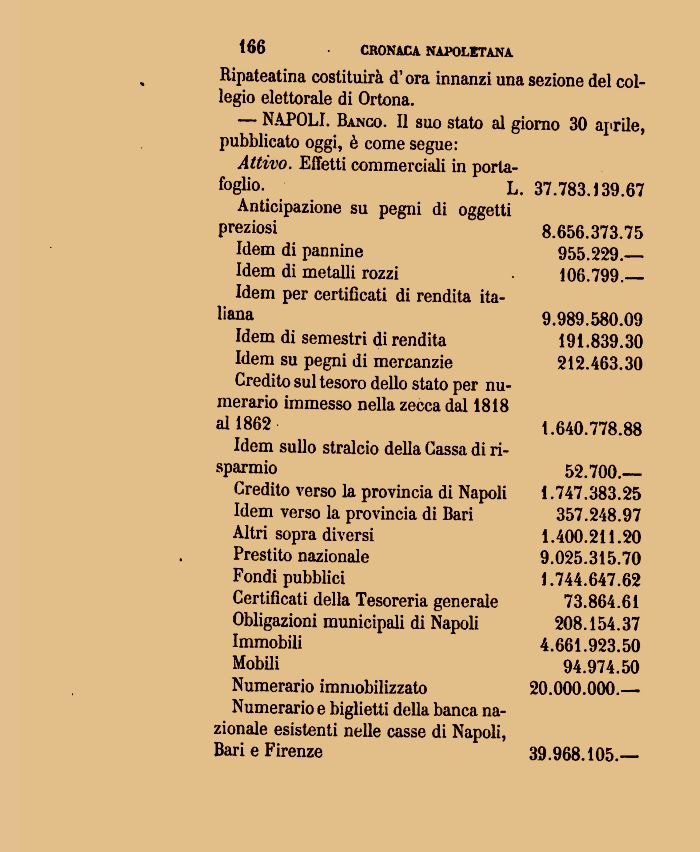 Idem sullo stralcio della Cassa di risparmio 52.700.— Credito verso la provincia di Napoli 1.747.383.25 Idem verso la provincia di Bari 357.248.97 Altri sopra diversi 1.400.211.20 Prestito nazionale 9.025.315.70 Fondi pubblici 1.744.647.62 Certificati della Tesoreria generale 73.864.61 Obligazioni municipali di Napoli 208.154.37 Immobili 4.661.923.50 Mobili 94.974.50 Numerario immobilizzato 20.000.000.— Numerario e biglietti della banca nazionale esistenti nelle casse di Napoli, Bari e Firenze 39.968.105.—