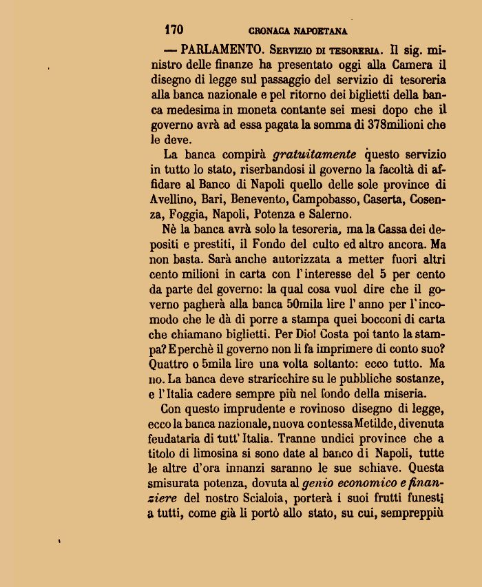 Con questo imprudente e rovinoso disegno di legge, ecco la banca nazionale, nuova contessaMetilde, divenuta feudataria di tutt' Italia. Tranne undici province che a titolo di limosina si sono date al banco dì Napoli, tutte le altre dora innanzi saranno le sue schiave. Questa smisurata potenza, dovuta al genio economico e finanziere del nostro Scialoia, porterà i suoi frutti funesti a tutti, come già li portò allo stato, su cui, sempreppiù