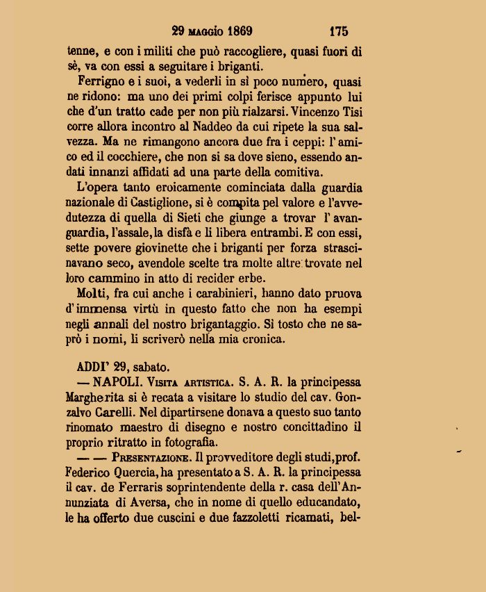 L'opera tanto eroicamente cominciata dalla guardia nazionale dì Castiglione, si è compita pel valore e l'avvedutezza di quella di Sieti che giunge a trovar l'avanguardia, l'assale,la disfà e fi libera entrambi. E con essi, sette povere giovinette che i briganti per forza strascinavano seco, avendole scelte tra molte altre trovate nel loro cammino in atto di recider erbe.