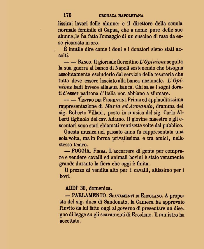 — PARLAMENTO. Scavamenti di Ercolano. A proposta del sig. duca di Sandonato, la Camera ha approvato l'invito da lui fatto oggi al governo di presentare un disegno di legge su gli scavamenti di Ercolano. Il ministro ha accettato.