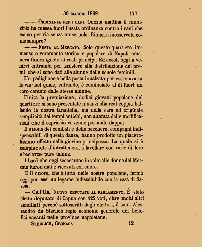 --Festa al Mercato. Solo questo quartiere immenso e veramente storico e popolare di Napoli rimaneva finora ignoto ai reali principi. Ed eccoli oggi a venirvi entrambi per assistere alla distribuzione dei premi che si sono dati alle alunne delle scuole feminili.