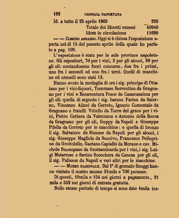 Hanno avuto la medaglia dė oro i sig. prėncipe di Otta-iano per i vini-liquori, Tommaso Sorrentino da Gragna-no per i vini e Bonaventura Pesce da Casamassiina per gli oh: quella di argento i sig. barone Farina da Salerno, Vincenzo Aline! da Cerreto, Ignazio Comentale da Gragnano e fratelli Vitiello da Torre del greco per i vini, Pietro Cettura da Valenzano e Antonio della Rocca da Gragnano per gli oli, Guppy da Napoli e Giuseppe Pilella da Cerreto per le macchine : e quella di bronzo il sig. Salvatore de Simone da Napoli per gli alcool, i sig. Giuseppe Magėiola da Succivo, Francesco Pellegrino da Grottolelle, Gaetano Capialbi da Morano e cav. Michele Buonopane da Grottaminarda per i vini, i sig. Luigi Matarrese e Savino Scoccherā da Canosa per gli oli, il sig. Palisson da Napoli e vari altri per le macchine.