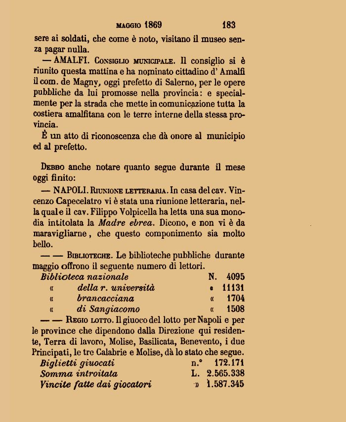 — NAPOLI. Riunione letteraria. In casa del cav. Vincenzo Capecelatro vi è stata una riunione letteraria, nella quale il cav. Filippo Volpicella ha letta una sua monodia intitolata la Madre ebrea. Dicono, e non vi è da maravigliarne, che questo componimento sia molto