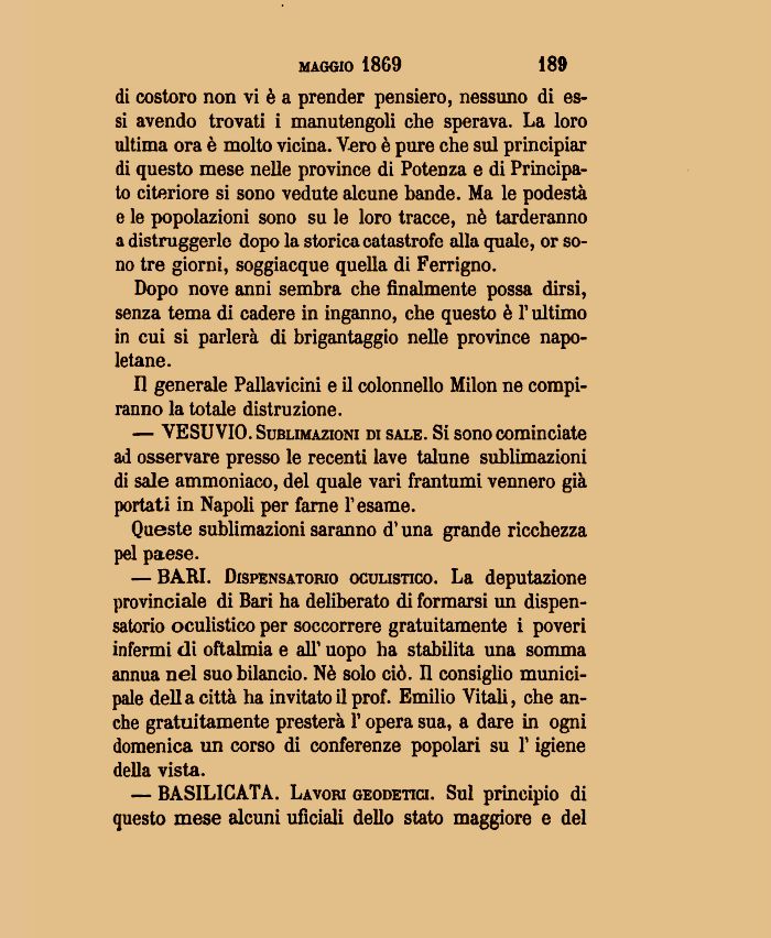 di costoro non vi è a prender pensiero, nessuno di essi avendo trovati i manutengoli che sperava. La loro ultima ora è molto vicina. Vero è pure che sul principiar di questo mese nelle province di Potenza e di Principato citeriore si sono vedute alcune bande. Ma le podestà e le popolazioni sono su le loro tracce, nè tarderanno a distruggerle dopo la storica catastrofe alla quale, or sono tre giorni, soggiacque quella di Ferrigno.