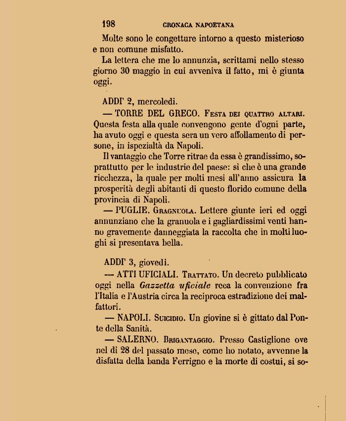 — TORRE DEL GRECO. Festa dei quattro altari. Questa festa alla quale convengono gente d'ogni parte, ha avuto oggi e questa sera un vero affollamento di persone, in ispezialtà da Napoli.