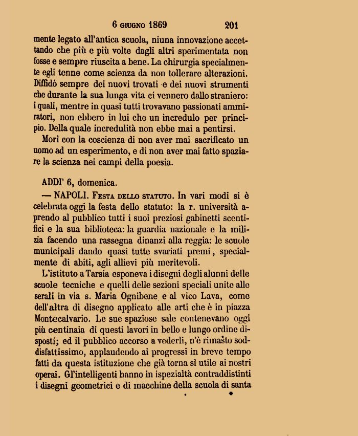 — NAPOLI. Festa dello statuto. In vari modi si è celebrata oggi la festa dello statuto: la r. università a-prendo al pubblico tutti i suoi preziosi gabinetti scenti-fici e la sua biblioteca: la guardia nazionale e la milizia facendo una rassegna dinanzi alla reggia: le scuole municipali dando quasi tutte svariati premi, specialmente di abiti, agli allievi più meritevoli.